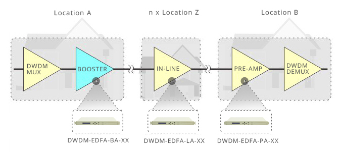 • Booster Amplifier, carries whole C-Band 1528nm ~ 1561nm of 40 channel on metro DWDM distance extension or single wavelength distance extension application