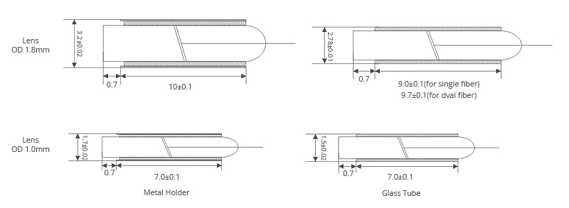 Dimensions (mm) 1.8(OD) Lens(Standard) 2.40x10 or 3.2x10 gold plated SS tube