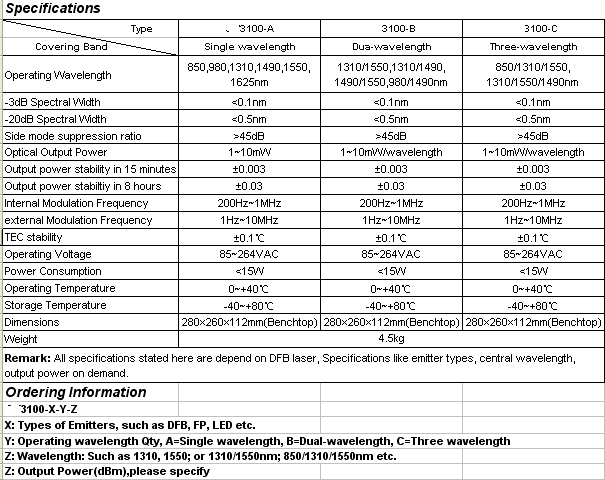 It specially used in manufacturing of optical passive components and testing of lab reserch.Relying on high accuracy automatic power control(APC) and automatic temperature control(ATC) techniques, 3100 series light sources has a very stable output power and wavelength.3100 can deliver 1 to 3 wavelengths upon customer request and laser types can be optional to satisfy customers various requests.Its an ideal test equipment for a required conditions of wide variety attenuation and high stable output power and wavelength.